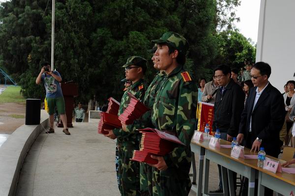 表演结束后,2012级景区开发与管理班杨珠江同学代表全体参训学员发言。随后,何明东副院长宣读了表彰决定,对军训成绩优秀表现突出的学员予以表彰。学院领导为优秀学员代表颁发了荣誉证书。随后,彭院长代表学院向昆明民族干部学院一大队司马政委赠送了锦旗,表达了我院师生对昆明民族干部学院一大队全体官兵的崇高敬意和衷心感谢。