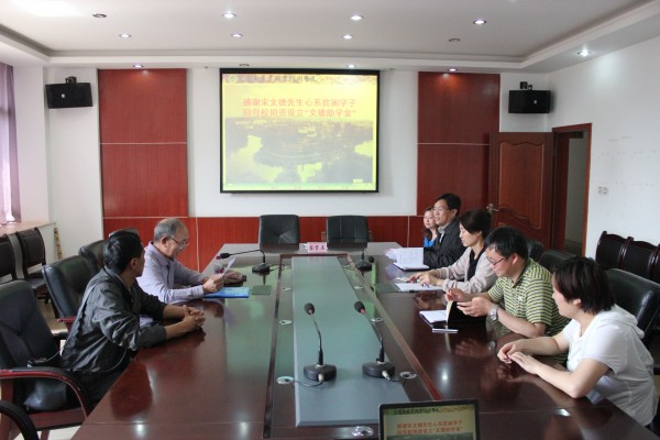2013年4月28日上午,我院与校友宋文德先生在茭菱校区四楼会议室举行捐资助学签字仪式,赵莉副院长出席会议。党院办主任金吉斌、学生工作处处长周诚、管理与信息工程系党总支书记黎红梅、学生资助工作人员和班主任代表等相关教师参加了会议,会议由学生工作处处长周诚主持。