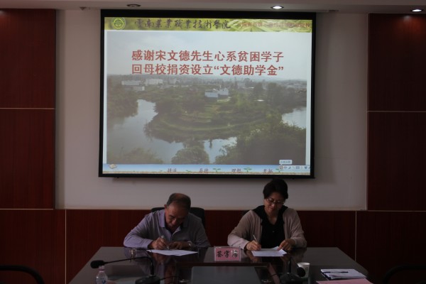 赵莉副院长代表学院和宋文德先生共同签署了“文德助学金”捐资助学协议书。“文德助学金”由我院1955年林业班毕业的校友、昆明滇宝建筑防水工程有限公司原董事长宋文德先生捐资设立,自今年起3年内每年资助我院品学兼优、家庭经济困难的学生20名,三年资助资金12万元。