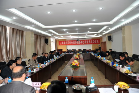 2011年11月4日上午9:00,我院在茭菱校区报告厅正式启动“云南省农民创业指导服务中心专家库成立仪式”。出席仪式的有云南省农业厅党组成员副厅长孙海清、省畜牧局副局长胡汉傈、农业厅科教处副处长段洪文、省劳转办副主任陈勇,学院党委书记崔金赋、院长彭志远、党委副书记赵刚,以及27位专家库成员。崔金赋书记主持仪式。