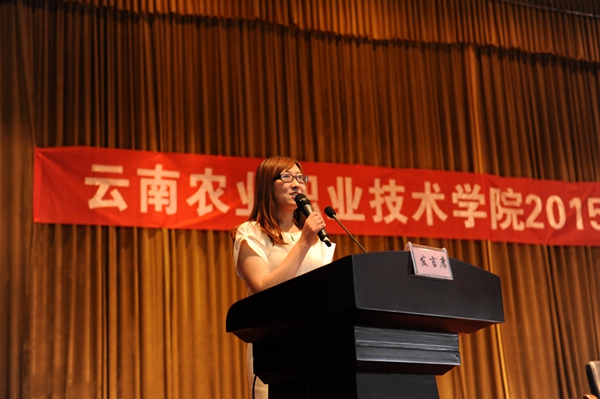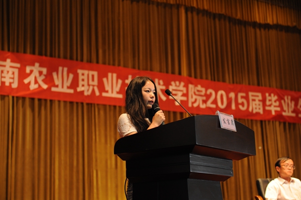 2015届毕业生代表发言。她在发言中回顾了在农职学习的成长点滴。表示感谢母校,为我们提供了学习求知的环境;感谢恩师给予的谆谆教诲;感谢父母的付出;感谢同学的互相关心支持。并希望同学们能够继续脚踏实地,努力做人做事,谦虚谨慎,戒骄戒躁,努力为母校争光!