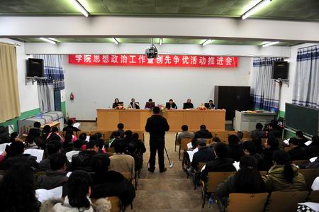2011年3月26日,室外春寒料峭、阴雨绵绵,学院小哨校区阶梯教室则春意浓浓,学院“思想政治工作暨创先争优活动推进会议”在这里隆重召开。学院党委书记崔金赋、院长彭志远、党委副书记赵刚、副院长何明东、赵莉、俞浩,以及学院正科级以上领导干部、学院党委办公室、组织部、宣传部、学生工作处(部)、思想政治理论教学部全体干部职工、学院全体辅导员及班主任共150余人出席了会议,彭院长主持会议。