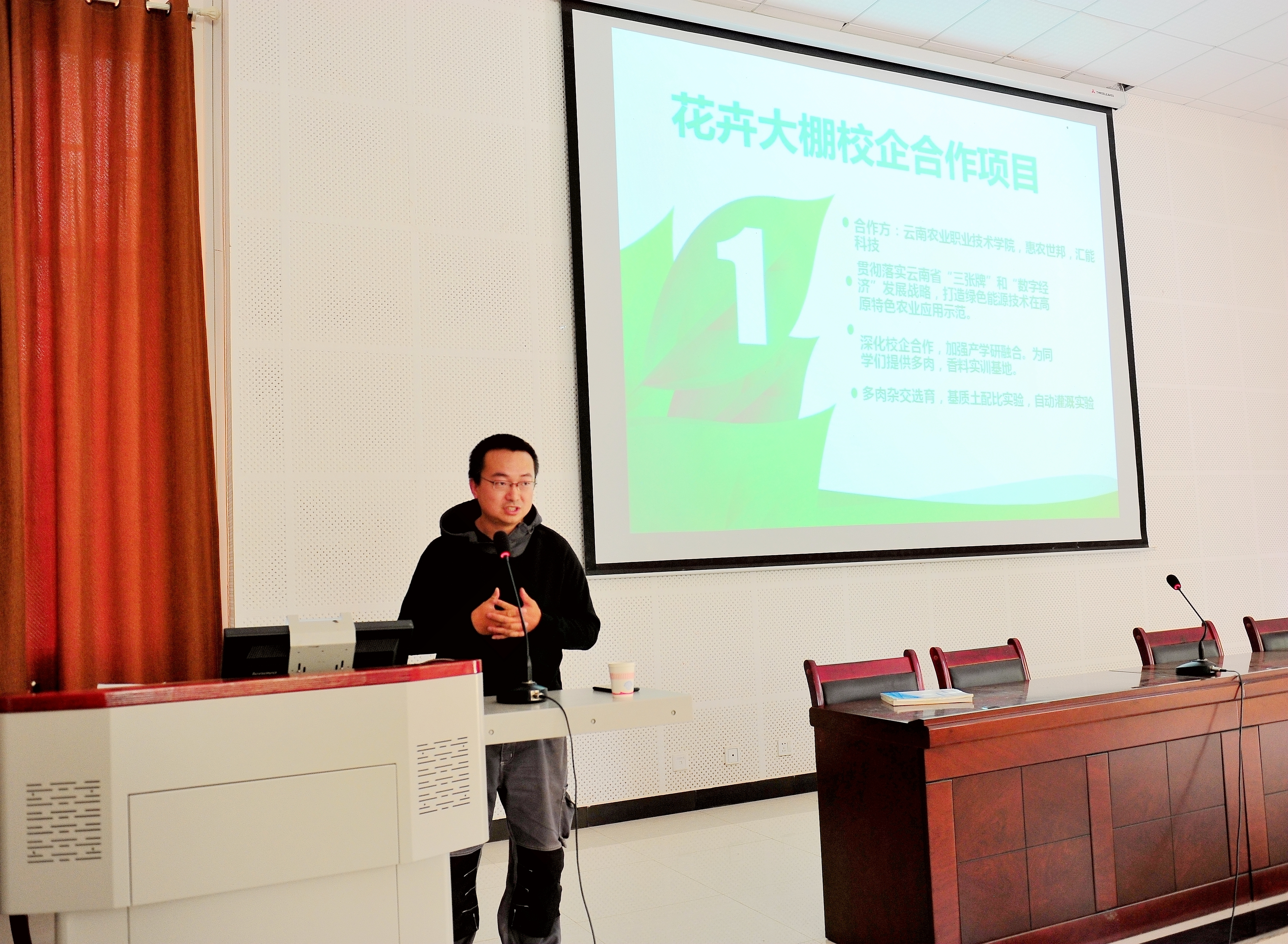 多肉植物既方便种植又绿色美观,作为盆栽在师生中广受欢迎。云南汇能科技有限公司负责人聚焦师生兴趣点,讲授了多肉品种鉴别、多肉市场概况、多肉营销形式、多肉种植技术、病虫害防治等内容。活动现场,师生兴趣盎然,学到了多肉植物养护知识,感受到了很多“绿色”正能量。