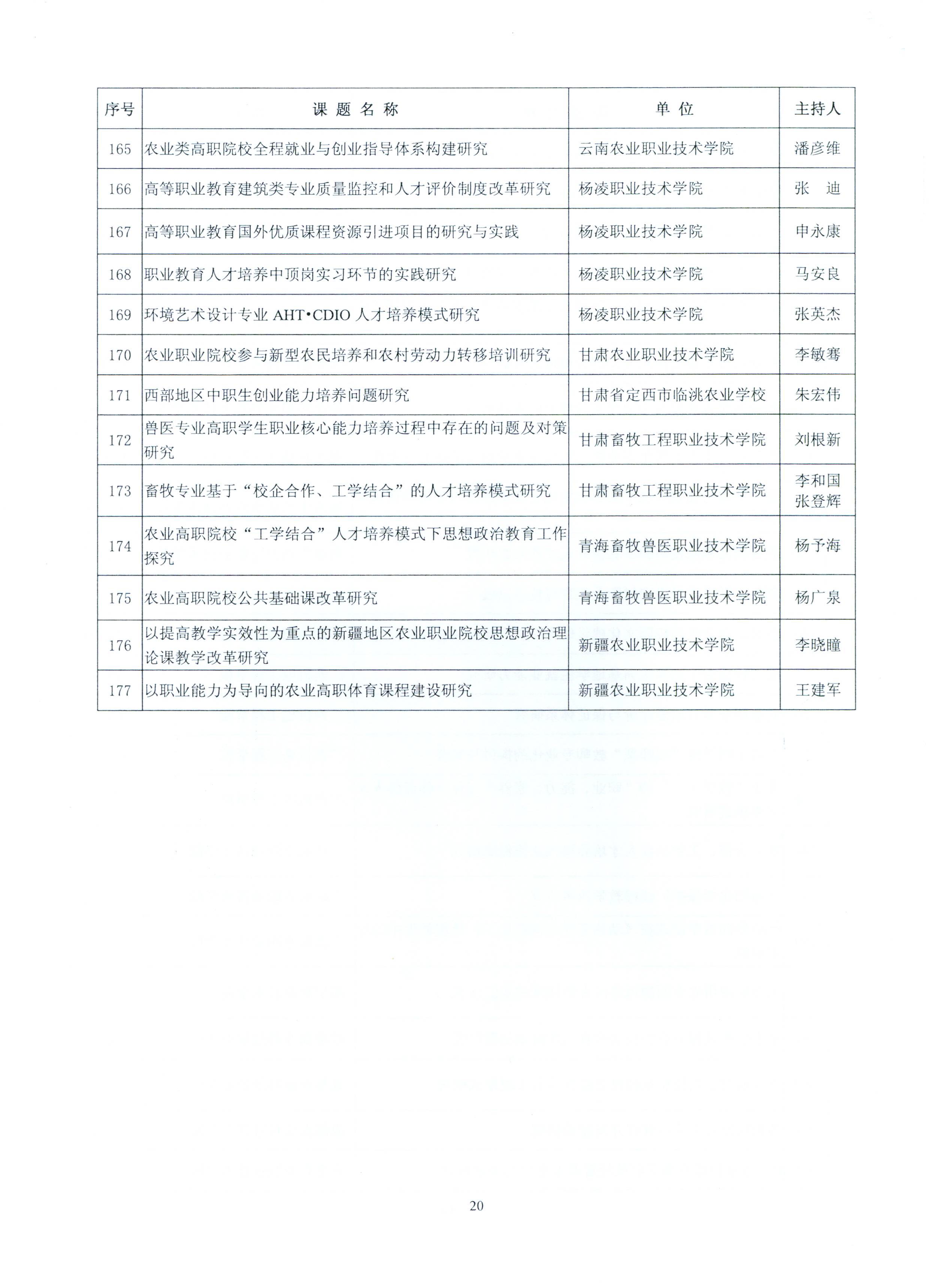 据中国职业技术教育学会农村与农业职业教育专业委员会全国农业职业技术研究会,《关于公布全国农业职业教育教学名师及教学成果评审结果的通知》(职教研〔2011〕8号)。中国职业技术教育学会农村与农业职业教育专业委员会于2011年6月至7月召开评审及审定会议,最终确定“十二五”期间全国农业职业教育科研课题立项177项。