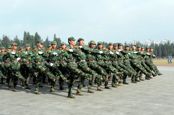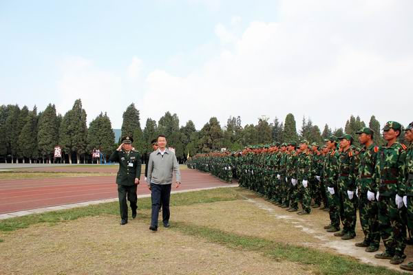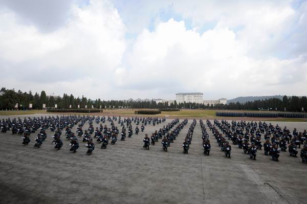 新生军训汇报表演在庄严的国歌声中拉开帷幕,在激昂的《中国人民解放军进行曲》中全体起立迎校旗,阅兵式正式开始。李永忠院长在昆明民族干部学院军训教研室主任朱平大校的陪同下检阅了新生军训队伍。同学们以饱满的热情迎接学校领导的检阅。李永忠院长高声问候:“同学们好,同学们辛苦了!”同学们铿锵有力应答:“努力学习,为校争光!”
