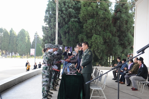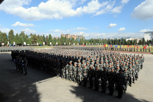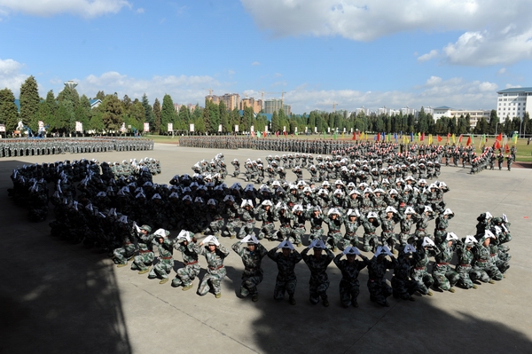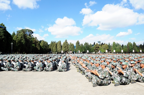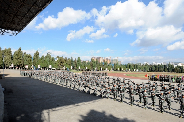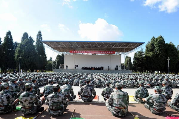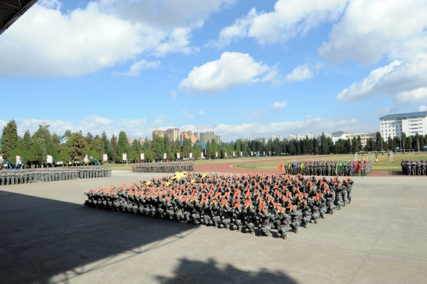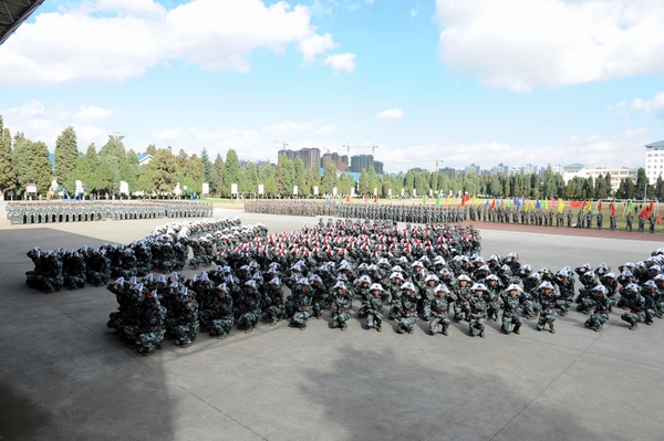 伴着深秋的落叶彩旗飘飘,随着铿锵的锣鼓胸怀激荡。洪亮的口号响彻云天,踏着有力步伐的队伍迎面而来。2013年11月9日上午10:00,sunbet官网2014级新生军训汇报表演暨总结表彰大会在昆明民族干部学院检阅台隆重举行。