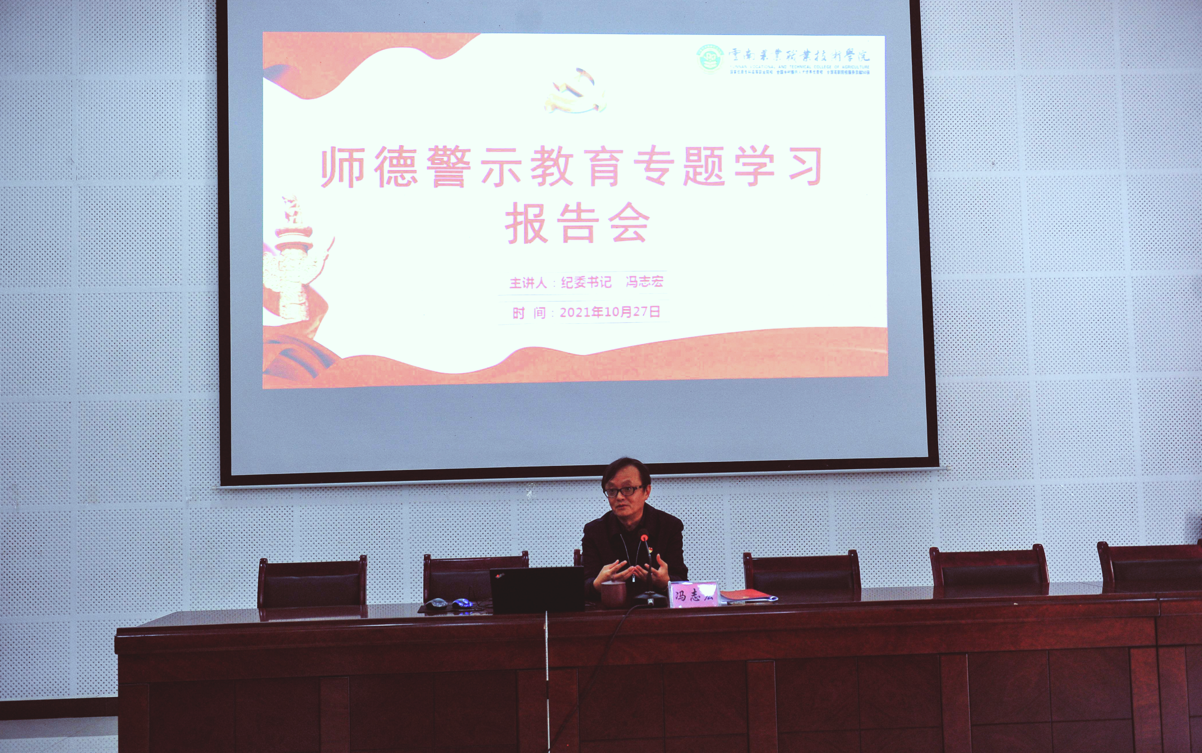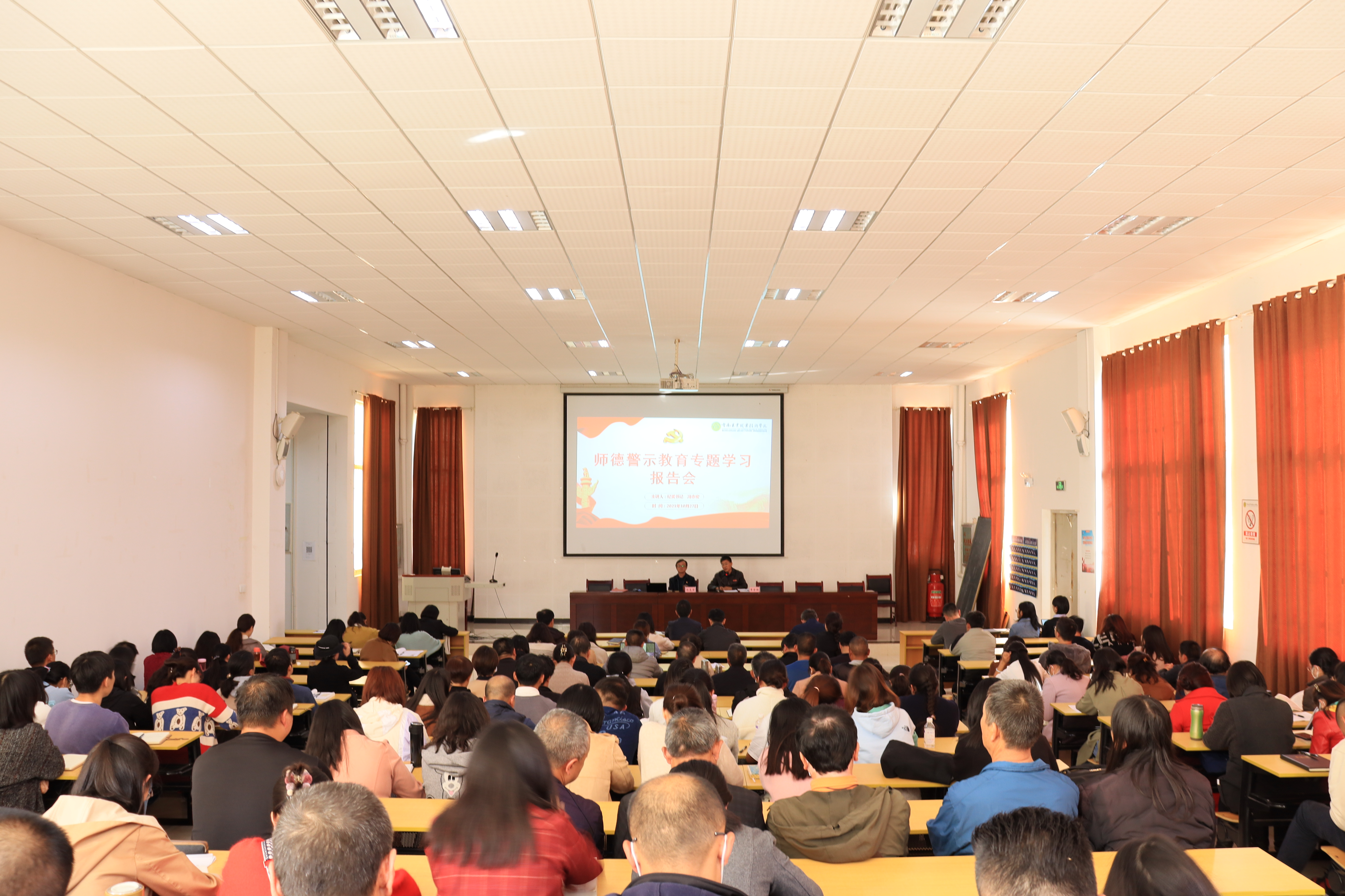 通知中心为全面贯彻习近平总书记关于教育的重要论述,落实全国、全省教育大会精神,根据《云南省教育系统师德专题教育实施方案》的要求,我院于10月27日下午在小哨校区综合楼阶梯教室召开师德警示教育报告会。党委书记崔金赋同志、党委副书记伍学龙同志出席会议,各有关部门全体人员,全体新入职教师,各二级学院副科及以上干部、教师代表共200余人参加了报告会。报告会由人事处处长李石友同志主持。