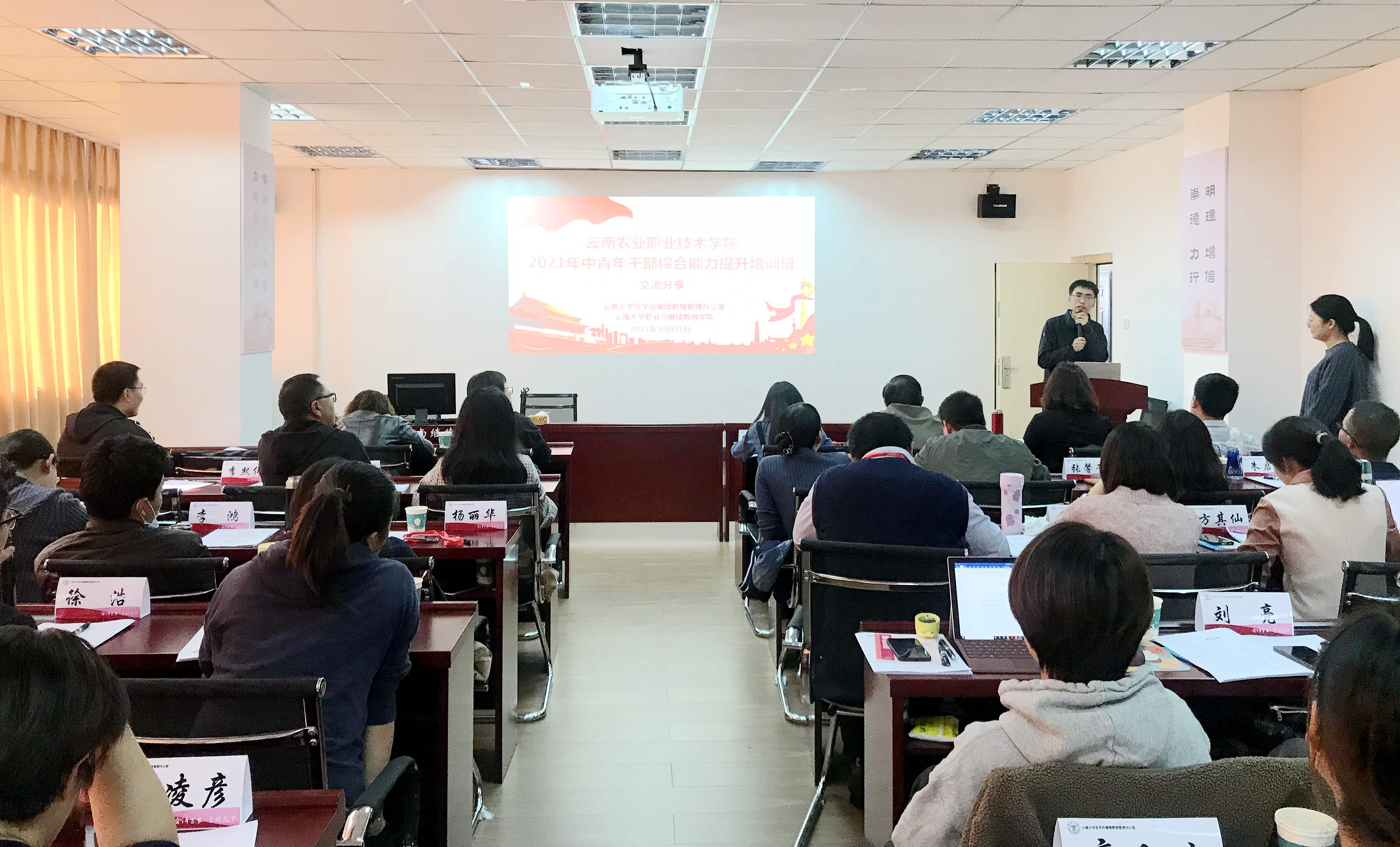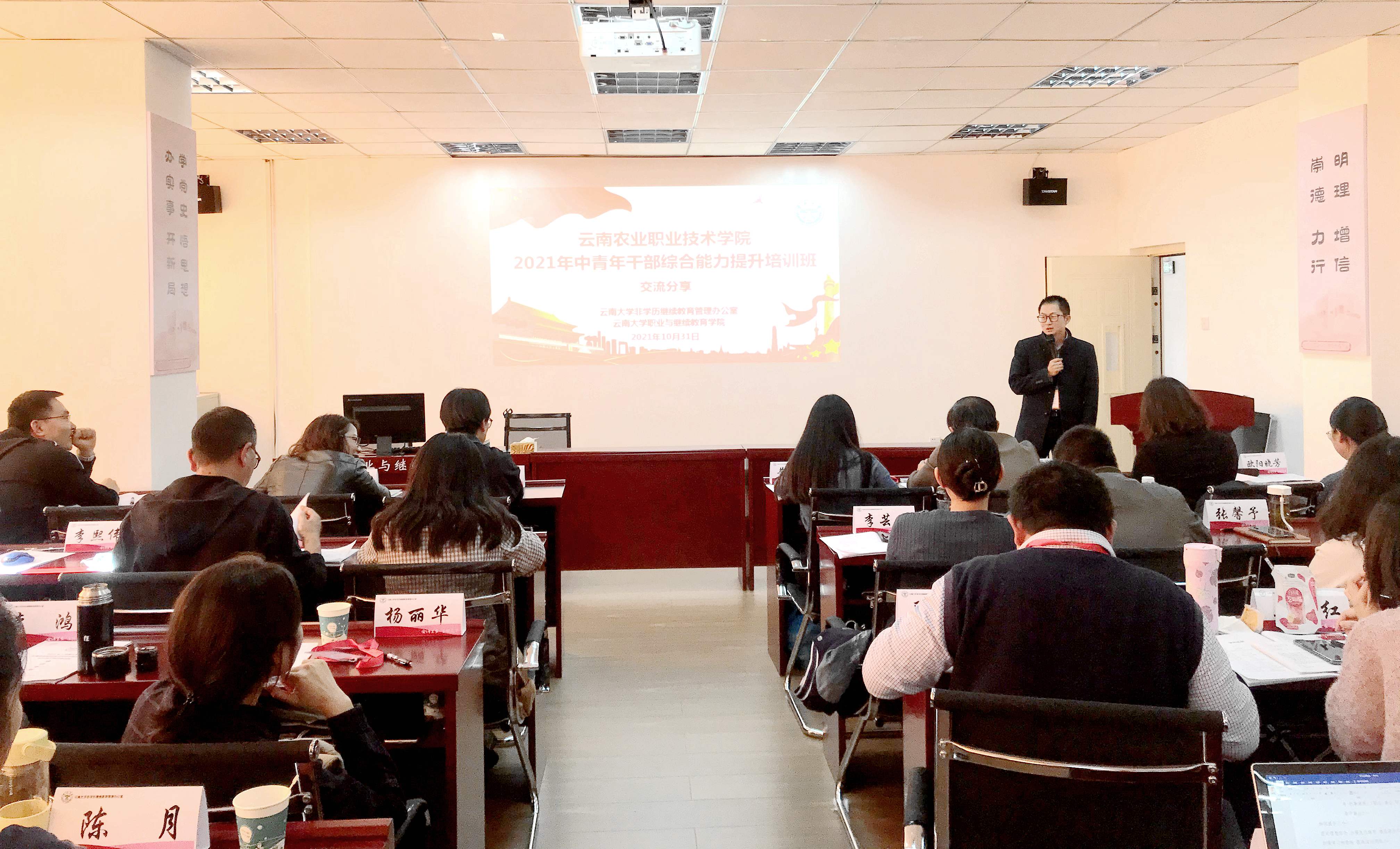 通知中心10月29至10月31日,学院第一届中青年干部综合能力提升培训班在云南大学东陆校区职业与继续教育学院成教楼顺利举办。本次培训的主要目的是努力建设一支忠诚干净担当实干的中青年干部队伍,为推动学院奋进新征程实现新作为提供坚强人才保障。