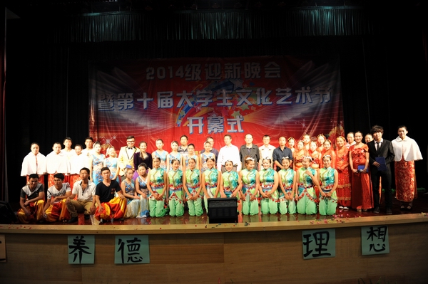 2014年9月23日晚上7点30分,学校在小哨校区大礼堂隆重举行2014级迎新晚会暨第十届大学生文化艺术节开幕式。本次晚会由党委宣传部、院团委主办,各二级学院团总支协办。李永忠院长出席晚会并致辞,出席晚会的还有学校副书记赵刚,副院长何明东、俞浩,党委宣传部部长冯志宏、学生工作处处长周诚、保卫处处长李昆、以及党院办、基础部、各二级学院的领导,部分教师、辅导员、班主任,部分学生等近900人汇聚一堂参加了晚会。