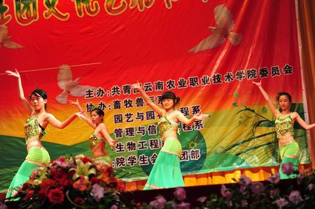 宣传部部长冯志宏向艺术节致贺词,学生工作处处长周诚宣布学院大学生艺术节开幕!随着Z·T乐队《还我蔚蓝》开场乐的奏响,社团文化艺术节在激昂的音乐声中拉开了序幕。藏族同胞一曲《洁白的哈达》仿佛把我们带到了万里以外的青藏高原,领略了那份豁达的高原情结;相声《说医学》更是将会场气氛带到了高潮,一浪高过一浪的笑声便是对表演同学的赞赏;一曲《天亮了》哀伤的曲调又将会场气氛拉进低谷......热烈的喝彩和掌声在会场此起彼伏,学生们的多才多艺在这里得到充分的发挥和展示。随着《七月火把节》舞步乐曲的终止,社团文化艺术节开幕式晚会帷幕徐徐落下。