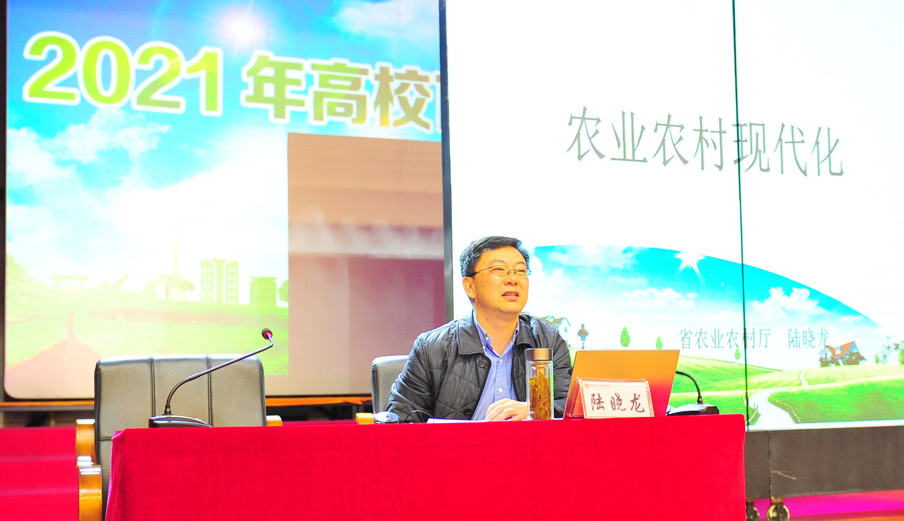 通知中心11月25日下午,根据省委教育工委统一安排部署,学院在小哨校区蚕桑礼堂举行2021年云南省“高校百场形势政策报告会”,邀请云南省农业农村厅党组成员、副厅长陆晓龙到校作题为《面向2035年的云南农业农村现代化之路》的专题报告。学院党政领导、师生代表共500余人参加,报告会由学院党委书记崔金赋同志主持。