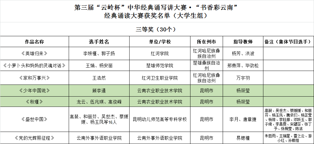 农学与园艺技术学院顾李通的作品《少年中国说》,畜牧兽医学院龙云、伍兆琪和食品药品与大健康学院高俊峰的作品《秋瑾》获经典诵读大赛大学生组三等奖。