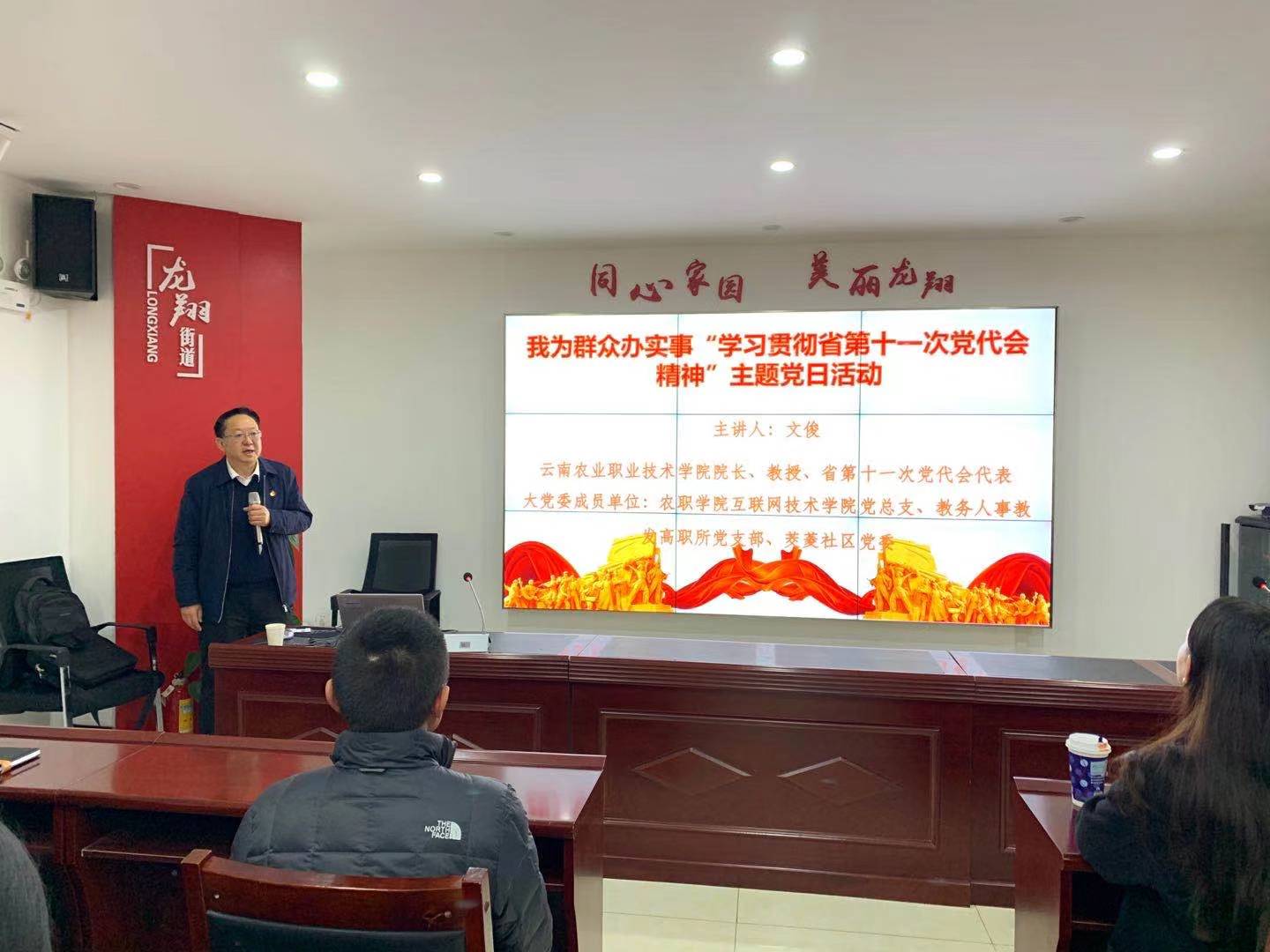 12月10日上午,我院党委副书记、院长、省第十一次党代会代表文俊到茭菱社区龙翔街道党群活动中心参加支部“结对共建”主题党日活动,为茭菱社区党员、群众和我院互联网技术党总支、教务人事教发高职所党支部党员、师生代表宣讲省第十一次党代会精神。