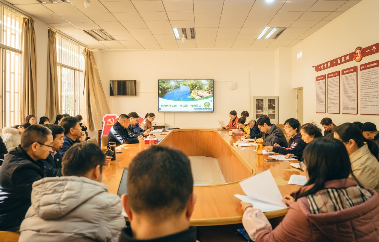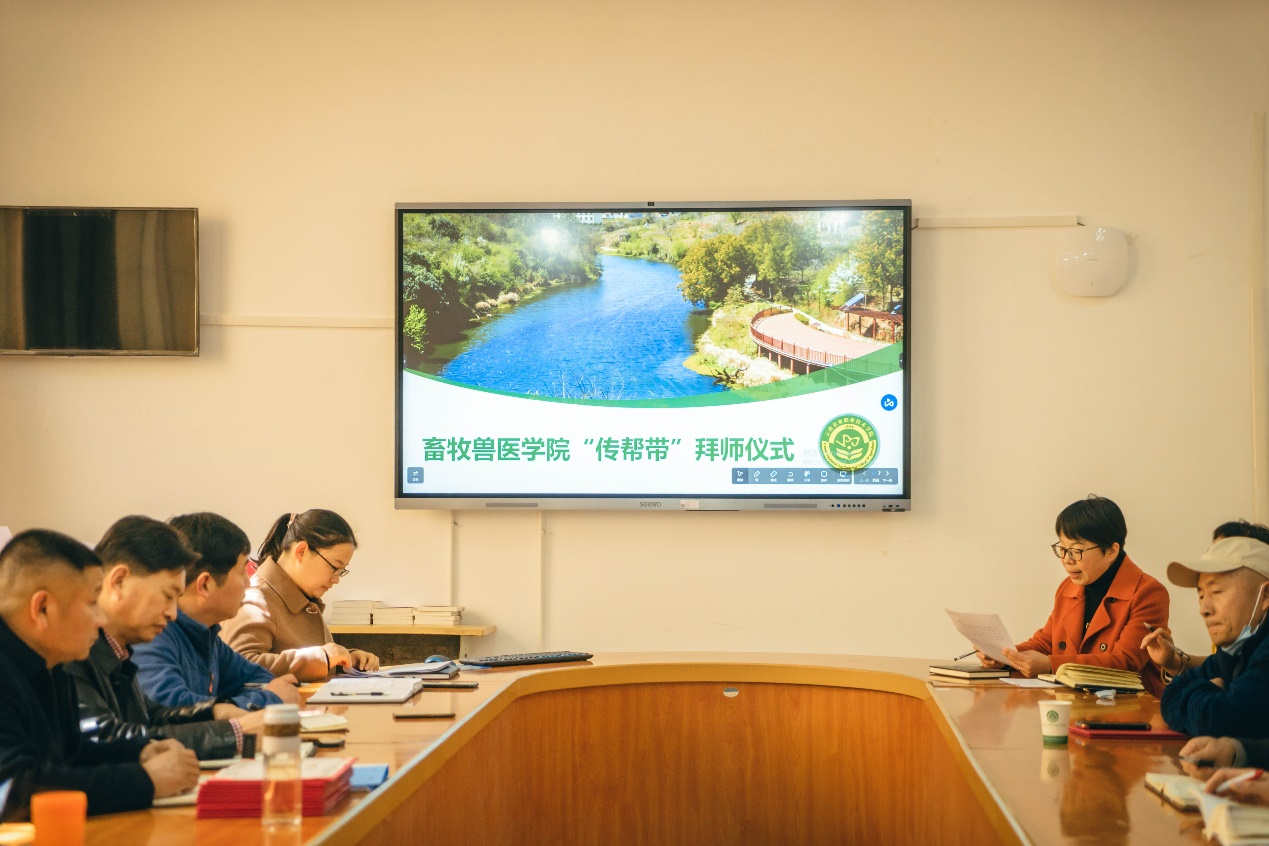 畜牧兽医学院党总支副书记保志鹏主持仪式,她指出此次“传帮带”仪式的意义和重要性,宣读了11对“传帮带” 结对教师名单,明确了结对双方的责任和义务。随后青年教师代表刘兴能在“传帮带”的拜师仪式上发言,他表示诚心、精心、细心、耐心是拜师学习的态度;勤学、勤问、勤看、勤听是拜师学习的方法;成长、成熟、成才、成功是拜师学习的目的;青年教师将会努力学习师傅无私奉献的品格,精益求精的工作作风和为人处世的原则,使自己成为教育工作的实践者,教育理论的探索者。相信在学院领导班子的正确领导下,通过师父们的言传身教,青年教师们一定会迅速成长,传承好“牧者、爱人、爱动物;医者、仁心、济苍生”的牧医精神,在“三尺讲台”上,实现人生的价值!