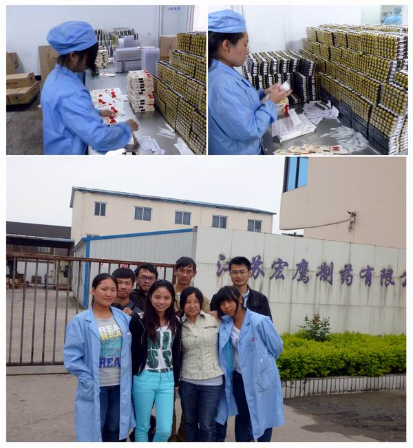 在学生进行实践工作期间,谭淑文老师还带领学生一起参观了整个宏鹰制药的生产线,大致了解了整个药物生产的流程,从中见识了许多先进的制药技术;同时也感受了江苏这个发达地区人们的认真、敬业、高效,以及发达的交通、丰富的资源与快节奏生活。